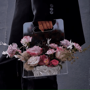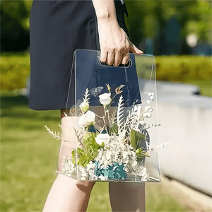 This clear acrylic display clutch is perfect for showcasing bouquets, flower arrangements, and gifts. Its transparent design allows for maximum visibility, making it a beautiful addition to any special occasion or event. Made of high-quality acrylic, it is durable and stylish, making it a must-have for any floral display.