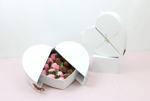 This Sweet Love Heart Flower Gift Box comes in two sizes and features a convenient handle for easy carrying. The heart-shaped box is adorned with gold writing, making it a perfect gift for beautifully displaying preserved or eternal roses, as well as chocolate strawberry arrangements. Make a lasting impression with this versatile and elegant gift box.