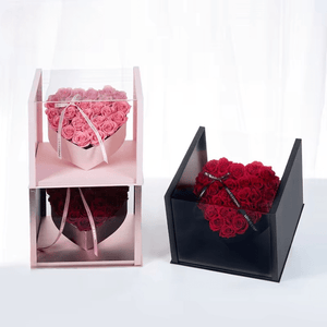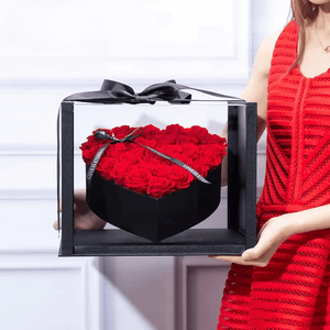 This elegant flower gift box features a beautiful tilted heart design, adding a touch of romantic charm to your gift giving. The clear cube box showcases the flowers inside, making it a stunning display. Perfect for expressing your love and affection on any special occasion.