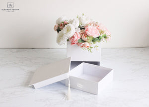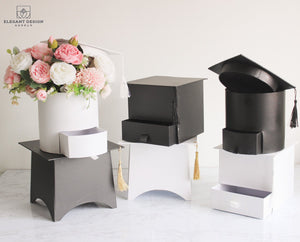 Give your special someone the ultimate graduation gift with this elegant Square Graduation Hat Flower Box. Its unique style box and drawer will make your arrangement stand out from the rest. Perfect for luxury flower, gift, or chocolate strawberry arrangements.